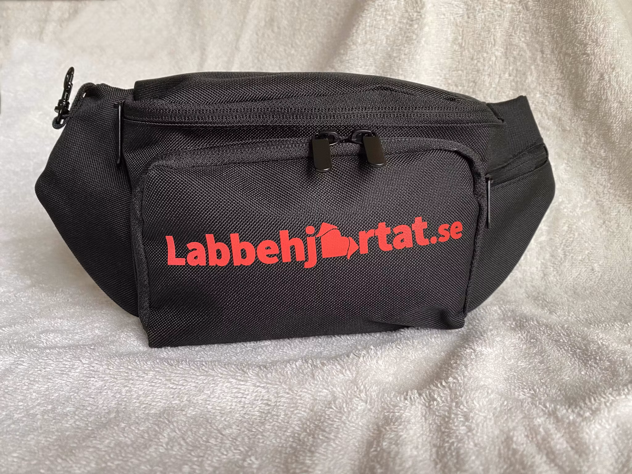 Midjeväska i svart nylon. Rött tryck på framsidan. 3 st fack med blixtlås, ett öppnas uppåt för lätt åtkomst nedåt i väskan, dubbelt blixtlås på ett fack på framsidan och ett litet fack på vänster sida. Enkelt spänne gör att bandet runt om kan ändras lätt till olika storlekar om det behövs. En hake är placerad på höger sida där man kan hänga nycklar, små dummies eller vad man vill.